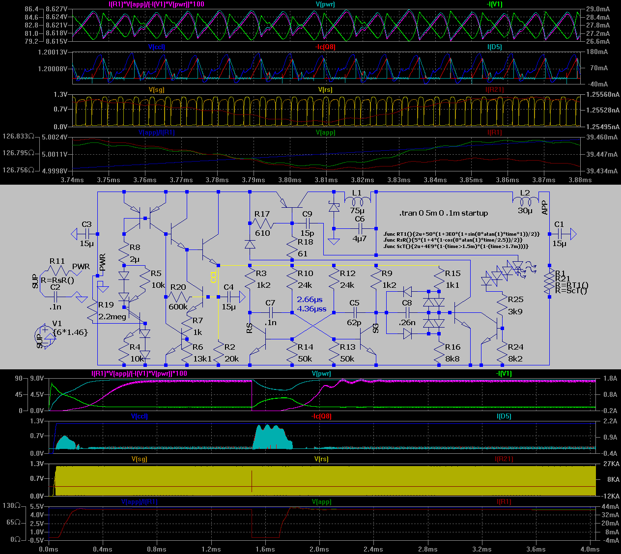 Quick tests :: both are using random interpreted 1.2V oscillators that may not perform so good in practise at that voltage -- the 5V adjusting network is poor , minimal - i primarily needed the P.OUT capability . . .